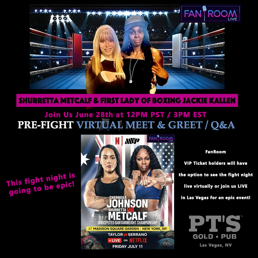Be In The Room with Shurretta Metcalf & First Lady of Boxing Jackie Kallen for a virtual meet and greet Pre-Fight special event on Saturday, June 28th, 2025 at 12PM PST / 3PM EST. This 2 in 1 event takes place on June 28th and July 11th. FanRoom LIVE's first ever FIGHT NIGHT LIVE July 11th! It's gonna be an epic event! To get your Ticket Now, please click on the image or buy ticket button! (Please note: Terms and Conditions Apply).